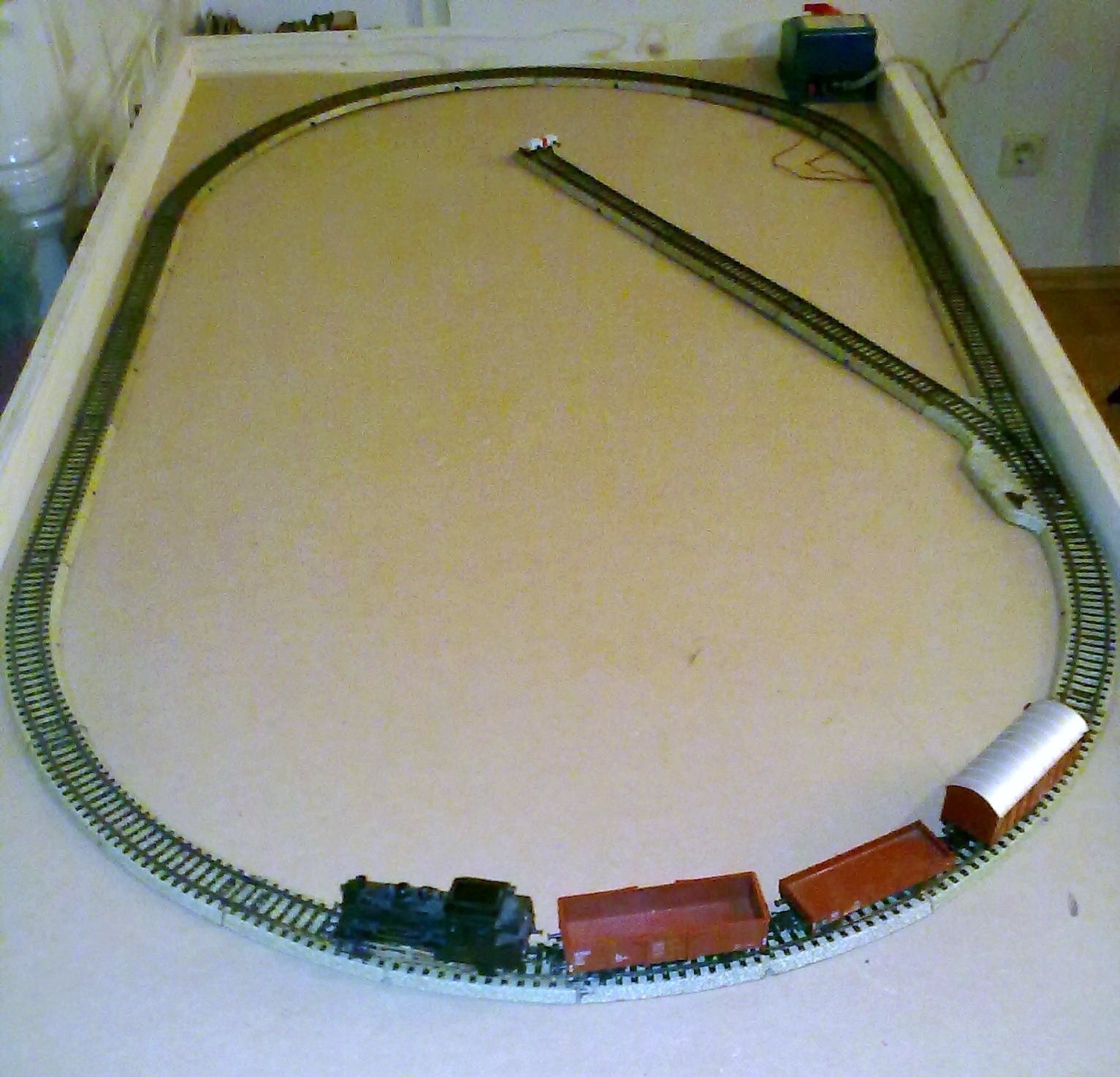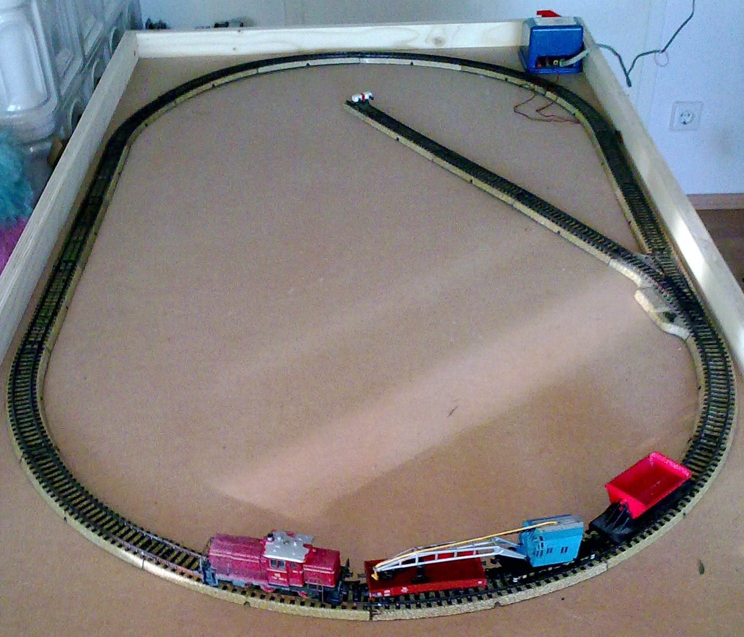 Das Startset besteht aus dem abgebildeten Gleisoval mit Abstellgleis und Trafo zur Zugsteuerung.